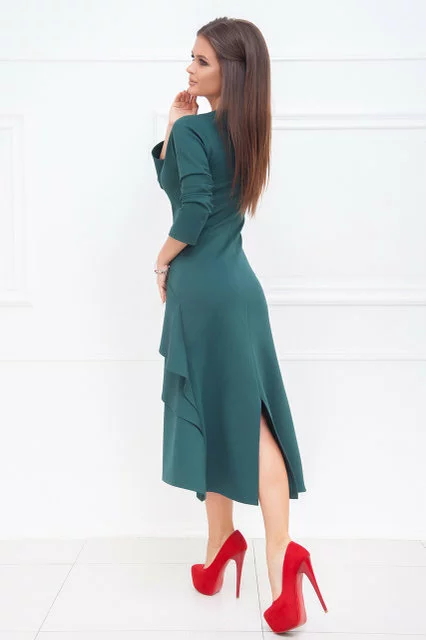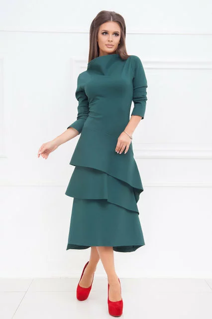 Приталенный силуэт. Красивый сложный крой, перед юбки украшен двумя диагональными воланами. Оригинальный вырез горловины переходит в неглубокий V-образный вырез на спинке. Длинна - ниже колена, сзади разрез. Длинна - ок.105 / 115см., Длина рукава - ок.60см. Ткань - плотный трикотаж (стрейтч). Состав - коттон / вискоза. Сезон - Демисезон. Коллекция Осень-Зима. Производство ― Lilitodessa.
