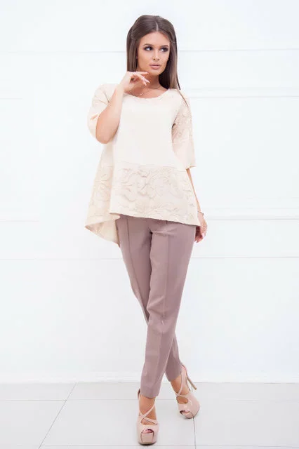 А-образный силуэт. Отрезной низ со сборками на спинке. Круглый вырез горловины. Декорирована нарядным гипюром в тон. Длина по борту ок.63см. Длина рукава - ок.32см. Ткань - креп (стрейтч) / нарядный гипюр с пайетками на сетке. Сезон - Демисезон. Коллекция Осень-Зима. Производство ― Lilitodessa.