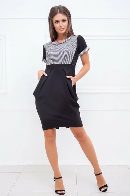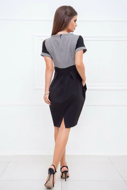 Приталенный силуэт. Завышенная талия. Оригинальный круглый вырез горловины. Сложный крой юбки с защипами, карманами по бокам и разрезом сзади. Застежка - пуговица и потайная молния на спинке. Длинна - ок.90см. Ткань - плотный трикотаж (стрейтч) / гипюр. Состав - коттон / вискоза. Сезон - Демисезон. Коллекция Осень-Зима. Производство ― Lilitodessa.